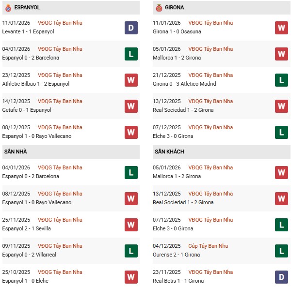 - Espanyol thắng 1, hòa 5, thua 4 trong 10 trận gặp Girona gần đây.