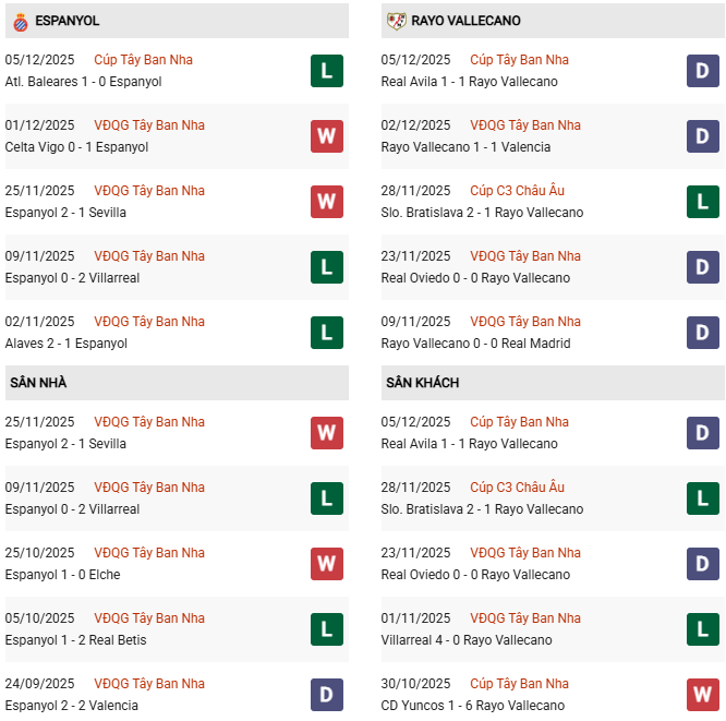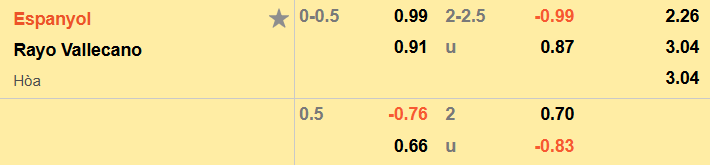 Điểm tựa lớn nhất của Espanyol nằm ở thành tích đối đầu gần đây khi họ bất bại Rayo Vallecano trong 3 lần chạm trán gần nhất tại La Liga. Đáng chú ý, ở trận lượt đi mùa trước, Espanyol từng vùi dập đối thủ tới 4-0 ngay trên sân Rayo, dù rằng khi đó họ lép vế về quyền kiểm soát bóng.