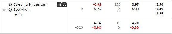 Mức kèo 0:0 (hòa được thua) cho thấy giới chuyên gia đánh giá hai đội khá cân bằng. Tuy nhiên, xét về phong độ, Zob Ahan đang ổn định hơn khi thua rất ít, trong khi Esteghlal Khuzestan sa sút rõ rệt với chuỗi trận thất bại kéo dài. Ở kèo này, lựa chọn đội khách Zob Ahan là phương án hợp lý, đặc biệt trong bối cảnh khả năng chia điểm là rất cao.