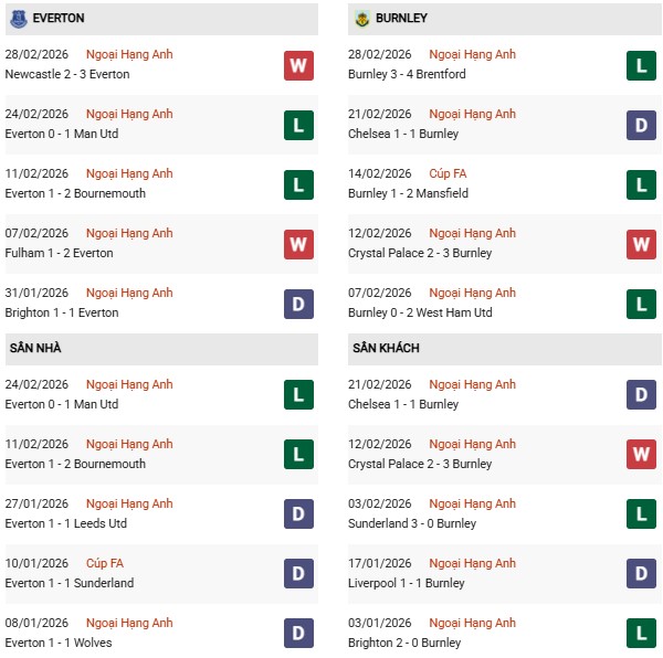 Do đó, Everton rất cần phải cải thiện thành tích sân nhà, chấm dút chuỗi 6 trận không thắng (2 hòa, 4 bại) tại sân Hill Dickinson (chỉ tính Premier League). Thật lý tưởng nếu họ làm được điều này trước Burnley, đội bóng đang có thành tích rất tệ trên sân đối phương.