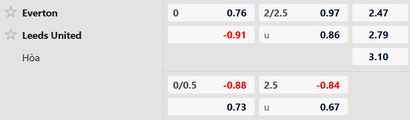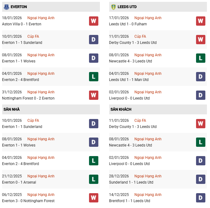 - 5 lần gần nhất gặp nhau, Everton thắng 2 thua 1 và hòa 2 trước Leeds.