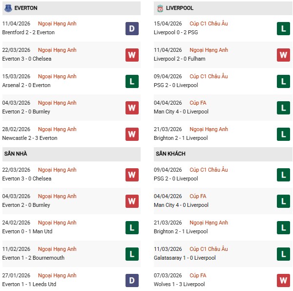 - Trên sân nhà, Everton thắng 1, thua 2 trước Liverpool.