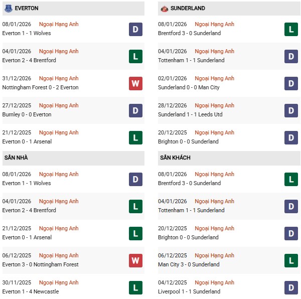 Everton đang có chuỗi 4 trận liên tiếp bất bại trước Sunderland, trong đó có 3 chiến thắng. Với thói quen hay thu về kết quả có lợi như vậy, khả năng cao là họ sẽ lại được tận hưởng niềm vui trước sự cổ vũ của đám đông khán giả nhà.