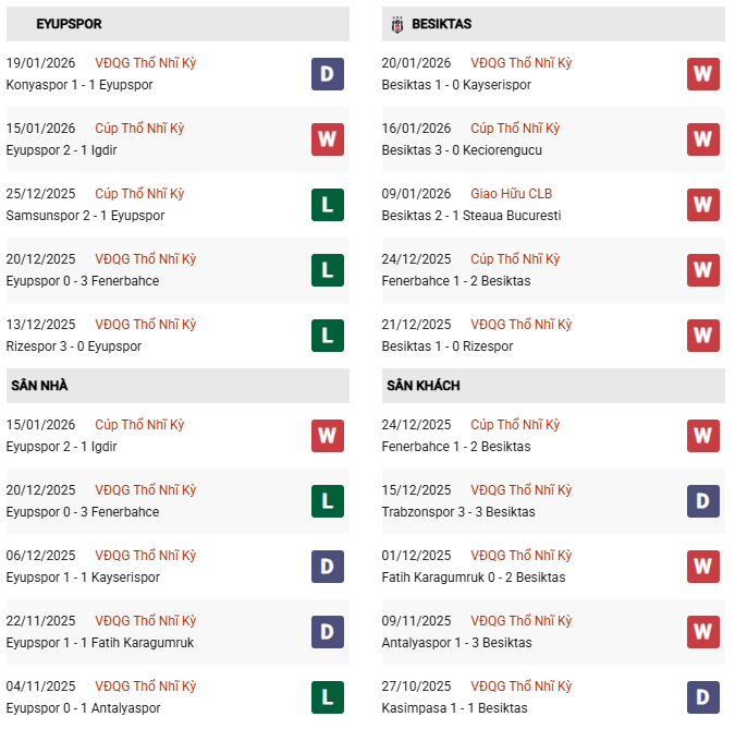 - Besiktas toàn thắng cả 4 trận đối đầu vừa qua trước Eyupspor.