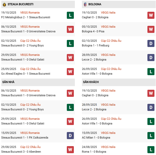 Cả hai đội đều khởi đầu không thuận lợi tại Europa League 2025/26 nên cuộc đối đầu này là cơ hội để họ giành 3 điểm. Tuy nhiên, với phong độ ổn định hơn, nhiều khả năng Bologna sẽ giành thắng lợi đầu tiên ngay trên sân của FCSB.