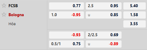 FCSB thua theo châu Á: FCSB thua 4, hòa 1, thắng 2 ở 7 trận gần nhất; thua 8, hòa 1, thắng 2 ở 11 trận sân nhà vừa qua. Còn Bologna thắng cả 2 trận gần đây. Do vậy, rất có thể FCSB lại thua tiếp ở trận đấu lần này.