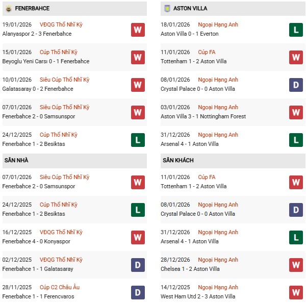 Fenerbahce bước vào cuộc đón tiếp Aston Villa với phong độ rất tuyệt vời. Họ thắng 7 và thua 1 ở 8 trận gần nhất, trong đó có chuỗi 4 trận toàn thắng gần đây. Chưa hết, phong độ trên sân nhà của họ lúc này rất ấn tượng khi chỉ thua 1, hòa 4 và thắng 11 sau 18 trận vừa qua.