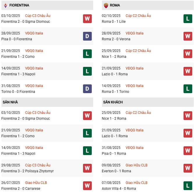 Thành tích đối đầu trong quá khứ đang rất cân bằng khi mỗi đội giành 2 chiến thắng và hòa nhau 2 trận ở 6 trận gần nhất tại Serie A. Mặc dù vậy, phong độ lúc này của 2 đội tại giải VĐQG đang là trái ngược nhau hoàn toàn. Tuy Fiorentina luôn được đánh giá cao khi thi đấu tại Artemio Franchi, nhưng bản lĩnh vượt khó và sự thực dụng của chiến lược gia Gasperini nhiều khả năng sẽ giúp AS Roma giành trọn 3 điểm ở màn so tài sắp tới.