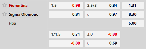Fiorentina chấp 1 1/2 bàn cả trận. Dù khởi đầu ở Serie A còn nhiều trắc trở, thầy trò Pioli vẫn có cơ hội lấy lại niềm tin tại sân chơi châu Âu. Trước một đối thủ còn non kinh nghiệm như Olomouc, khả năng chủ nhà giành chiến thắng cách biệt là rất cao. Ở kèo này, lựa chọn cửa trên vẫn là phương án đáng tin cậy.