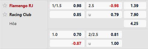 Flamengo có thể giành chiến thắng trong trận đấu này, dựa trên thực tế là họ đang bay cao ở thời điểm hiện tại, đang cạnh tranh cho chức vô địch giải quốc nội và đã giành được một số danh hiệu gần đây. Tuy nhiên, để thắng cách biệt sẽ là nhiệm vụ không đơn giản khi đối thủ Racing Club cũng đang có phong độ rất cao. Sàn giao dịch châu Á ghi nhận mức kèo Flamengo chấp 1 1/4 trái, bằng với trận đối đầu gần nhất khi họ chỉ có chiến thắng 2-1 và khiến các nhà đầu tư ôm hận. Trước một Racing Club đang có thành tích thắng kèo 8/10 trận sân khách vừa qua, đại diện Brazil có thể gặp khó khăn.