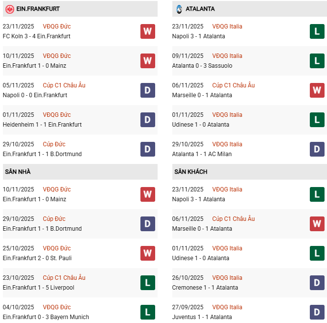 Trong quá khứ, Eintracht Frankfurt từng đụng độ Atalanta 2 lần và cả 2 trận đều kết thúc với tỷ số hòa. Gặp lại Atalanta rất có duyên trên sân khách, sẽ chẳng dễ để Frankfurt phá dớp thường xuyên không thắng nổi các đại diện Italia.
