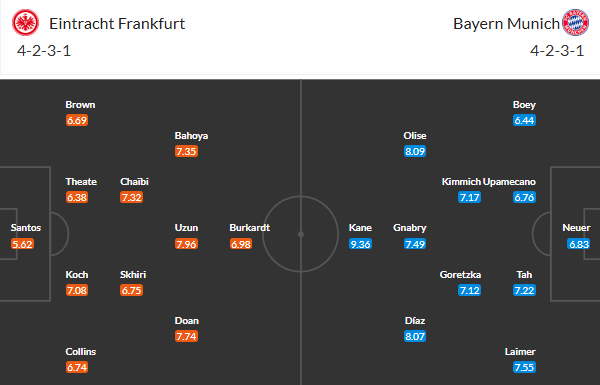 8 trận chính thức từ đầu mùa của Frankfurt đều có ít nhất 4 bàn thắng được ghi. Với Bayern Munich, hàng công đội khách ghi tới... 22 bàn sau 5 trận từ đầu mùa, tức trung bình hơn 5 bàn/trận. Chưa kể, 3/4 trận đối đầu gần nhất cũng có tối thiểu 4 bàn.