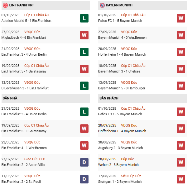 Trái ngược với sự thiếu ổn định của Frankfurt là màn trình diễn bùng nổ tới từ Bayern Munich. Kể từ sau thất bại trước PSG ở bán kết FIFA Club World Cup đầu tháng 7, đoàn quân HLV Vincent Kompany đã duy trì mạch 12 trận thắng liên tiếp trên mọi đấu trường. Mới nhất, Bayern Munich nghiền nát chủ nhà Pafos ở vòng phân hạng Champions League hồi giữa tuần.