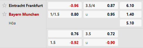 Bayern hiển nhiên được xếp ở cửa trên với mức chấp 1 1/4 bàn. Với màn trình diễn bùng nổ từ đầu mùa giải, sự tự tin của các cầu thủ Bayern Munich đang lên rất cao và nhiều khả năng Hùm xám sẽ có chiến thắng trước chủ nhà Frankfurt để củng cố ngôi đầu bảng.