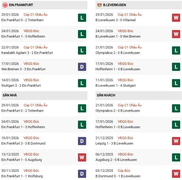 Leverkusen và Frankfurt vừa trải qua loạt trận cuối vòng phân hạng Champions League 2025/26 với kết cục khác nhau. Trong khi Frankfurt bị loại thì Leverkusen sẽ đá play-off. Đó được xem là động lực cho Leverkusen trong chuyến hành quân tới sân của Frankfurt ở vòng 20 Bundesliga.