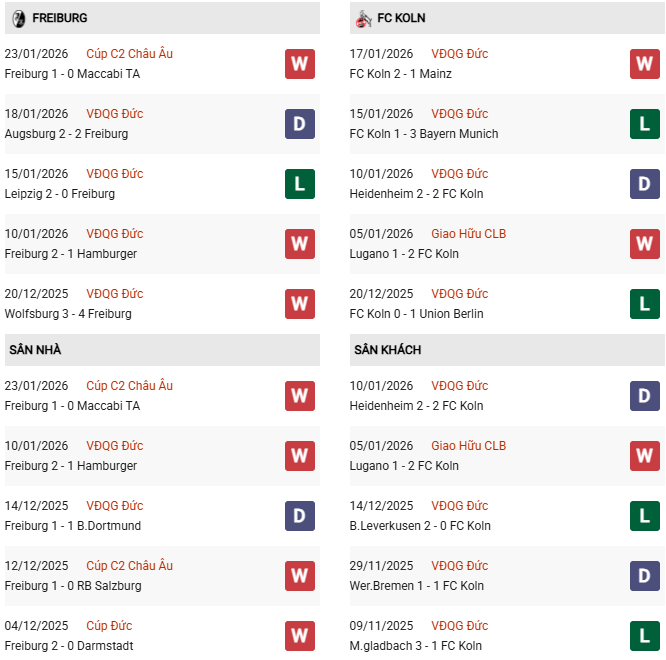 - Trên sân nhà, Freiburg thắng 8, thua 1 trước Koln.