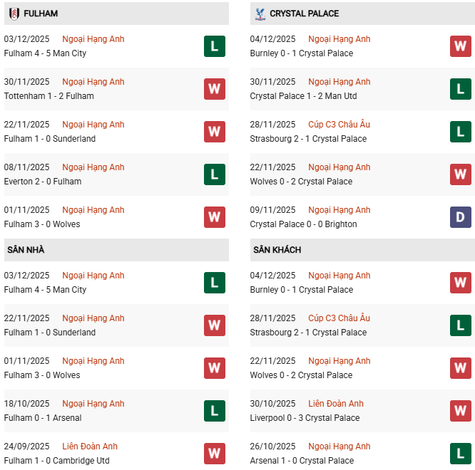- Trên sân nhà, Fulham thắng 2, thua 4 trước Crystal Palace.