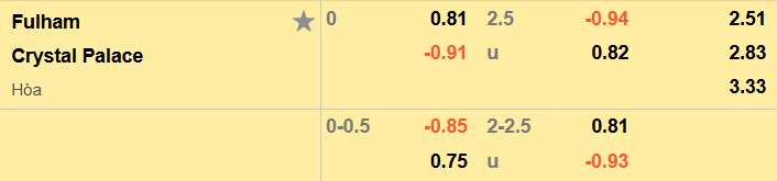 Lẻ bàn thắng: 3 trận liên tiếp của Crystal Palace cùng 4/5 trận gần đây của chủ nhà Fulham đều kết thúc với tổng bàn thắng là lẻ. Kịch bản lẻ bàn thắng cũng diễn ra ở màn so tài gần nhất hồi tháng 3 vừa qua.