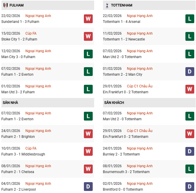 Xét đối đầu, Fulham chiếm ưu thế khi thắng 3/5 lần chạm trán gần nhất, bao gồm chiến thắng 2-1 hồi tháng 11/2025. Với phong độ sân nhà ổn định và sự tự tin từ lịch sử đối đầu, Fulham có cơ sở hướng tới một kết quả tích cực, còn Tottenham nhiều khả năng tiếp tục đối diện thử thách lớn trong hành trình tìm lại chiến thắng.