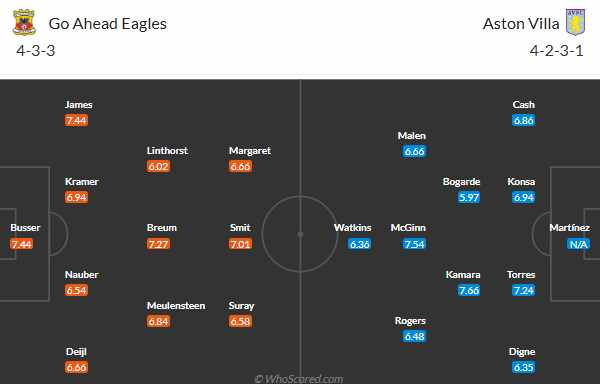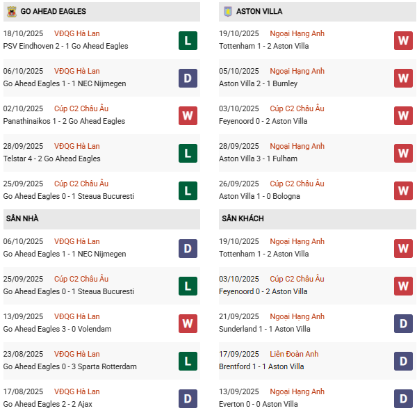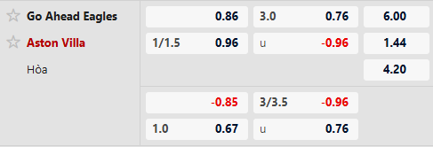 Phong độ của GA Eagles đang kém Aston Villa rất xa. Mặc dù Go Ahead Eagles có lợi thế sân nhà nhưng bị đánh giá thấp hơn Villa rất nhiều với mức kèo được chấp 1 1/4 bàn. Do đó, Aston Villa nhiều khả năng sẽ có 3 điểm.