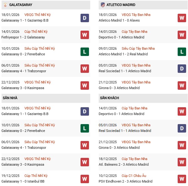 Galatasaray trên thực tế cũng không xứng tầm đối thủ của Atletico. Điều này được thể hiện rõ qua việc đại diện của Thổ Nhĩ Kỳ gần đây hay bị nửa đỏ trắng thành Madrid át vía trong các cuộc đối đầu. Thống kê cho thấy, Atletico toàn thắng trước Galatasaray trong cả 3 cuộc đụng độ vừa qua, trong đó là chiến thắng 2-0 vào năm 2015, cũng trong khuôn khổ Champions League.