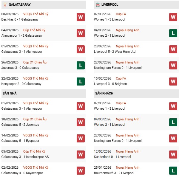 - Trên sân nhà, Galatasaray thắng 4, hòa 1 trước Liverpool.