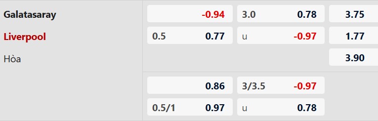 Lẻ bàn thắng: Cả 5 cuộc chạm trán gần nhất, 3/4 trận vừa qua của Galatasaray và 7/8 trận gần đây của Liverpool đều có tổng bàn thắng là lẻ. Ngoài ra, 5/6 chuyến làm khách vừa qua của Liverpool cũng khép lại với tổng bàn thắng không chia hết cho 2.