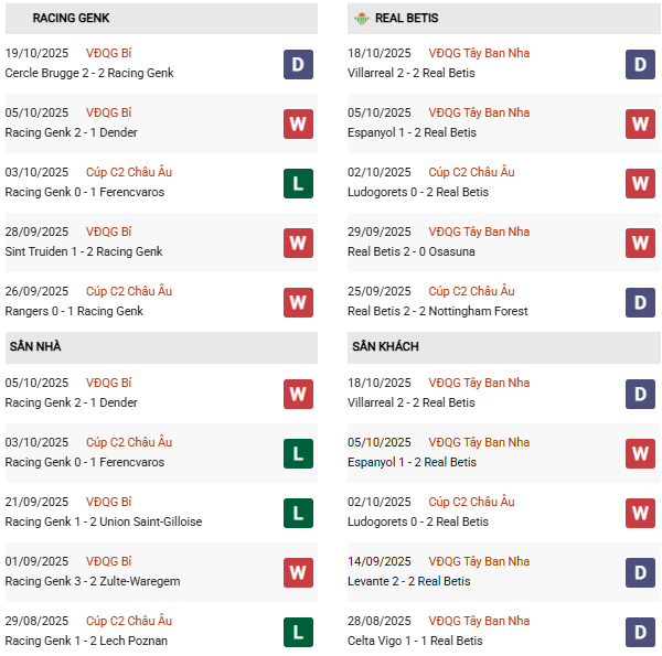 Betis lúc này đang có phong độ ổn định, trước đó họ thường làm người hâm mộ lo lắng ở bất cứ trận đấu nào mà mình góp mặt. 4 trận gần nhất Betis đã bất bại, trong đó đội bóng này giành được tới 3 chiến thắng. Tuy nhiên cũng giống Genk, Betis đã không có chiến thắng ở trận gần nhất. Nhưng Betis hài lòng với trận hoà đó, bởi đối thủ mà họ đối đầu được đánh giá mạnh hơn.