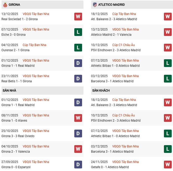 Thành tích đối đầu giữa Girona và Atletico Madrid cho thấy sự áp đảo rõ rệt của đội bóng áo sọc đỏ trắng thành Madrid, với 4 chiến thắng trong 5 lần gặp nhau gần nhất. Cuộc chạm trán gần nhất chứng kiến Atletico giành chiến thắng 4-0 trên sân khách trước Girona, trong khi các chiến thắng trên sân nhà của họ cũng rất thuyết phục. Mặc dù Girona đang cải thiện đáng kể thành tích sân nhà gần đây, nhưng nhiều khả năng Atletico vẫn nắm giữ lợi thế đáng kể trong trận đấu này.
