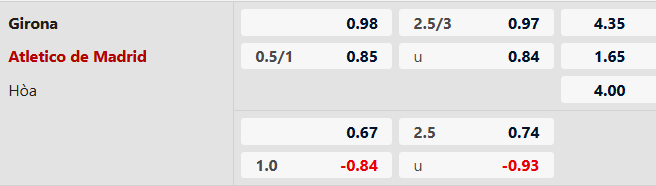 Atletico Madrid hiển nhiên được đánh giá cao hơn với mức kèo 3/4 bàn. Rất khó có bất ngờ dành cho Girona, ngay cả khi họ được chơi trên sân nhà. Với ưu thế vượt trội trước thầy trò HLV Michel, Atletico Madrid có thể sẽ muốn thể hiện sức mạnh ngay từ đầu và giành chiến thắng ở trận này để trụ vững top 4.