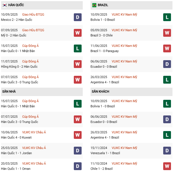 Lần gần nhất Brazil thi đấu là vào ngày 10/9, trong thất bại 0-1 trước Bolivia. Đồng thời, họ mới chỉ giành được 2 chiến thắng trong 5 trận gần nhất. Có thể thấy, phong độ của đoàn quân HLV Carlo Ancelotti là không ổn định. Xét về sức mạnh đội hình, Brazil hơn hẳn Hàn Quốc, nhưng điều này không có nghĩa là họ sẽ dễ dàng đánh bại đối thủ.