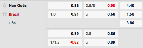 Đây là một trận đấu khó đoán, bởi Hàn Quốc là một đội bóng mạnh và có được những nhân tố tốt nhất, trong khi Brazil lại không có phong độ tốt nhất gần đây. Cộng thêm việc thiếu vắng nhiều trụ cột, Selecao có thể sẽ gặp khó trước Hàn Quốc. Với kèo chấp 1 hòa của Brazil, nên đặt niềm tin vào cửa dưới ở trận này.