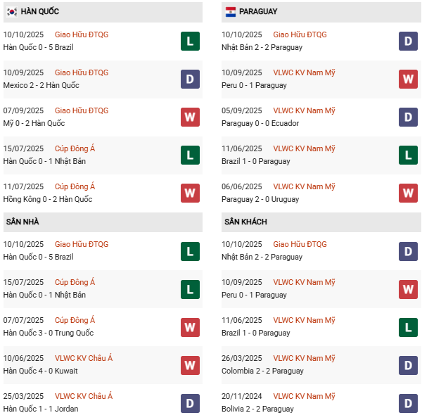 - Hàn Quốc thắng 2, hòa 3 trong 5 trận gặp Paraguay gần đây.