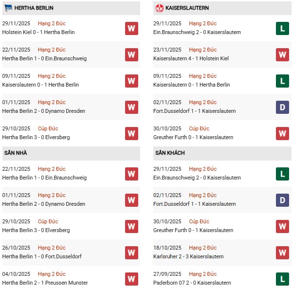 - Hertha Berlin thắng 5, hòa 1, thua 4 trong 10 trận gặp Kaiserslautern gần đây.
