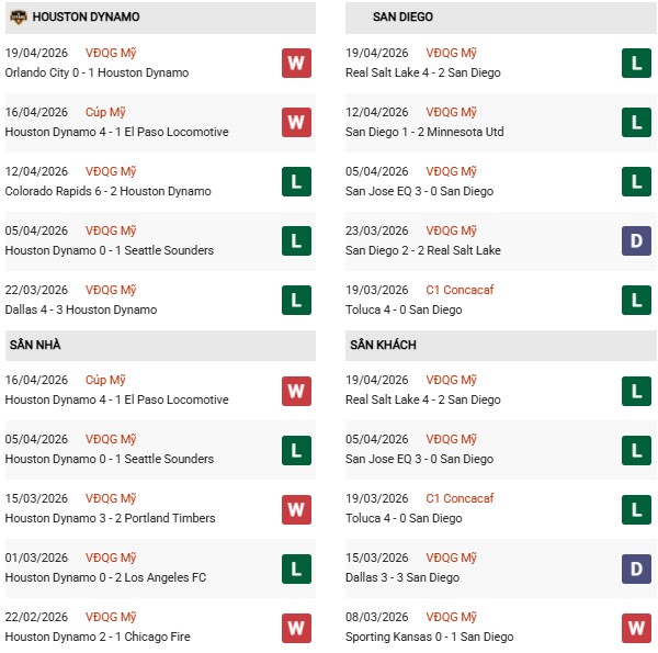 - Houston Dynamo thắng 1, thua 1 trong 2 trận gặp San Diego gần đây.