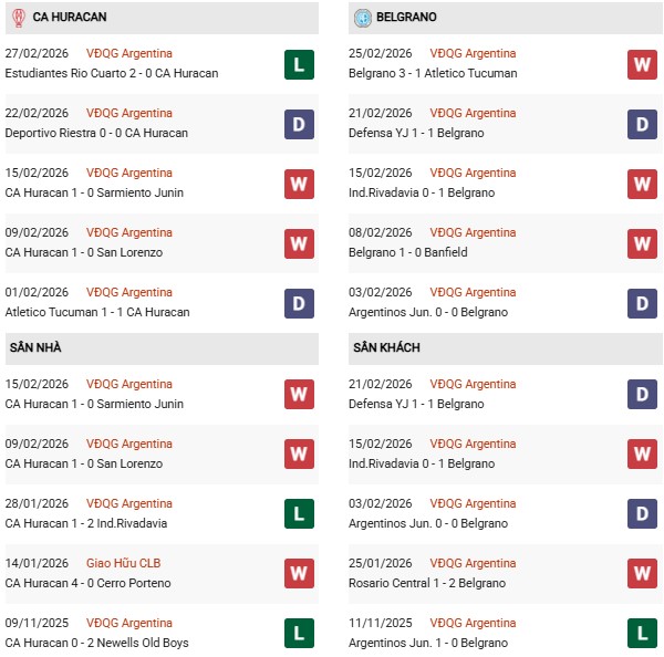 - Trên sân nhà, Huracan thắng 1, thua 1 trước Belgrano.