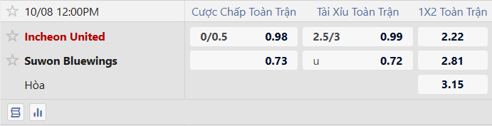 Incheon United gần đây có phong độ ngang ngửa. Dù Incheon được đánh giá cao hơn ở trận đấu này với mức kèo -1/4 theo handicap nhưng họ đang xuống phong độ, nên khả năng chỉ kiếm được 1 điểm khi đối đầu với Suwon Bluewings. Chọn Suwon Bluewings.