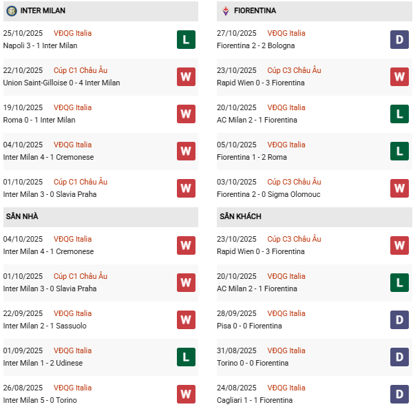 - Inter Milan thắng 7, hòa 1, thua 2 trong 10 trận gặp Fiorentina gần đây.