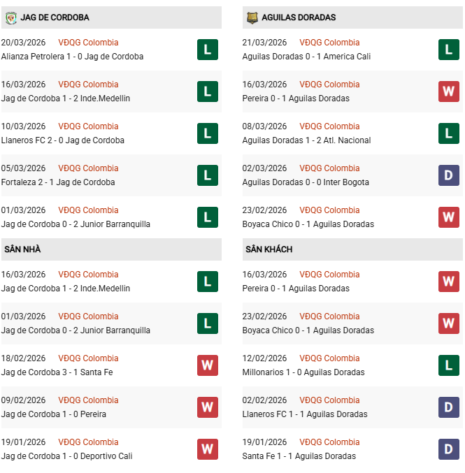 Trái ngược với sự rệu rã của chủ nhà, Aguilas Doradas dù không có phong độ quá bùng nổ nhưng lại thể hiện được bản lĩnh và sự lỳ lợm đáng nể, đặc biệt là trong các chuyến hành quân xa nhà. Trong 5 trận gần nhất, họ giành được 2 chiến thắng, 1 trận hòa và để thua 2 trận. Đáng chú ý, Aguilas Doradas đang sở hữu thành tích sân khách cực kỳ ấn tượng với chuỗi 3 trận bất bại liên tiếp khi xa nhà (2 thắng, 1 hòa), bao gồm các chiến thắng thuyết phục trước Pereira (1-0) và Boyaca Chico (1-0). Lối chơi thực dụng, đề cao tính kỷ luật và khả năng tận dụng sơ hở của đối phương giúp Aguilas Doradas luôn giành được kết quả có lợi trên sân đối phương. Với tâm lý hưng phấn và sự ổn định cao hơn, đội khách đang nắm giữ lợi thế cực lớn trước một Jaguares đang chạm đáy phong độ.