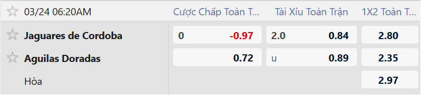 Soi kèo châu á Jaguares de Cordoba vs Aguilas Doradas: