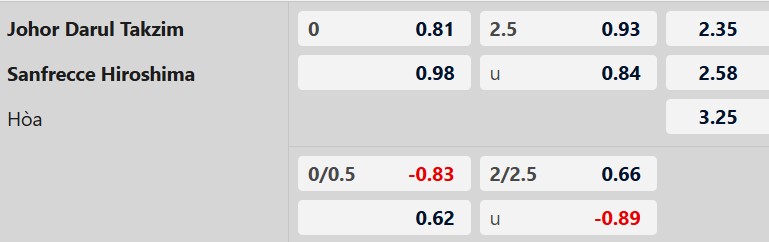 Johor Darul Takzim toàn thua theo châu Á trong 3 trận đấu gần đây ở AFC Champions League. Sanfrecce Hiroshima sẽ giành chiến thắng và trận đấu sẽ có “mưa gôn”. Với mức kèo hòa được thua theo handicap, thầy trò HLV Bartosch Gaul hứa hẹn là điểm đến an toàn cho giới đầu tư.