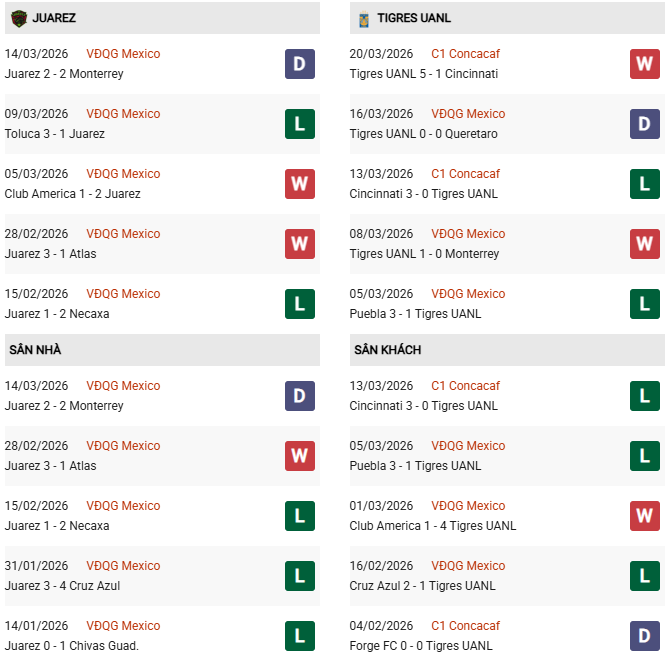 Tại Liga MX, Tigres vẫn duy trì sự ổn định khi đánh bại Monterrey 1-0 và cầm hòa Queretaro 0-0. Đội bóng này sở hữu lối chơi chắc chắn cùng khả năng kiểm soát thế trận khá tốt, đặc biệt là ở những trận đấu gặp các đối thủ bị đánh giá thấp hơn.