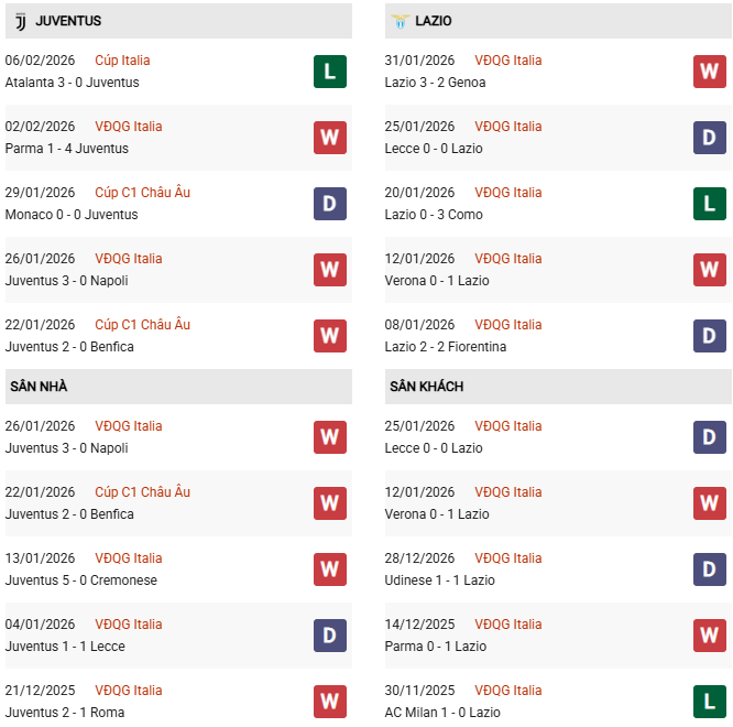 - Trên sân nhà, Juventus thắng 8, hòa 2 trước Lazio.
