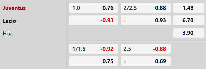 Juventus thắng theo châu Á: Lazio thua theo châu Á 6/8 trận Serie A gần đây. Juve thắng theo châu Á 5/7 trận chính thức vừa qua khi chấp đối phương 1/2 đến 1 bàn. 13 lần chạm trán gần nhất giữa đôi bên tại Turin khi Juve nhường Lazio 1/2 bàn trở lên, Lão phu nhân có tới 11 trận thắng theo châu Á.