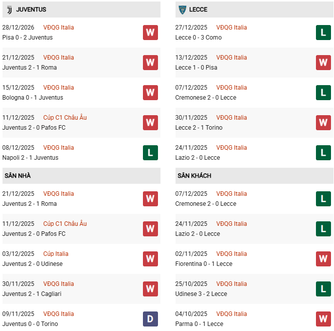 - Trên sân nhà, Juventus thắng 8, hòa 2 trước Lecce.