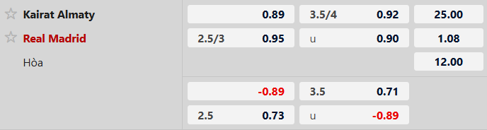 Mức kèo chấp 2 3/4 bàn nghiêng hoàn toàn về Real Madrid cho thấy sự khác biệt quá lớn giữa hai đội. Sức mạnh nhân sự, kinh nghiệm và vị thế ở sân chơi châu Âu của Real Madrid vẫn là ưu thế quá lớn. Dù gặp bất lợi về mặt nhân sự và phải di chuyển hơn 6000km, khả năng cao Los Blancos vẫn sẽ thắng dễ trước Kairat Almaty và thắng luôn kèo đấu châu Á.