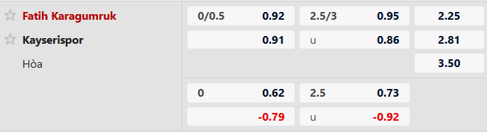 Mùa này cả Karagumruk lẫn Kayserispor đều đang gặp khủng hoảng với hàng phòng ngự khi đã phải nhận về đến 20 bàn thua. Tuy nhiên, với bối cảnh Karagumruk mới ghi 8 bàn còn Kayserispor tệ hơn với chỉ 6 pha lập công, gần như không thể kỳ vọng vào một trận cầu bùng nổ bàn thắng. Tỷ lệ tài xỉu 2 3/4 sẽ phù hợp hơn dành cho sự xuất hiện của kèo Xỉu sau 90 phút tương đối nhạt nhòa.