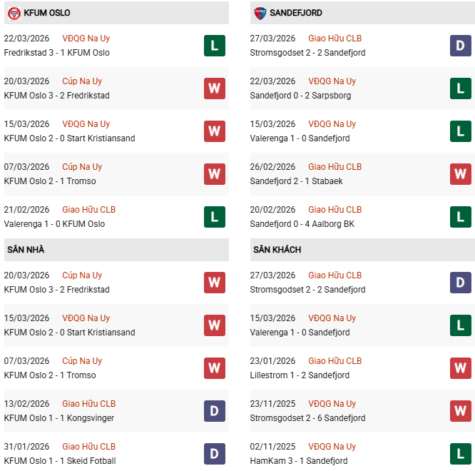 - KFUM Oslo thắng 1, hòa 3, thua 6 trong 10 trận gặp Sandefjord gần đây.