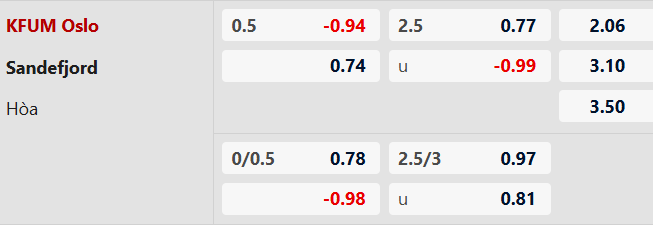 Mức chấp 1/2 bàn cho thấy KFUM Oslo được đánh giá cao hơn khá rõ nhờ lợi thế sân nhà và phong độ đầu mùa tích cực hơn. Sandefjord đang toàn thua, chưa ghi bàn và tinh thần bị ảnh hưởng đáng kể. Với khả năng nhập cuộc tốt trên sân nhà, KFUM Oslo đủ sức hướng tới chiến thắng.