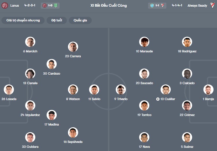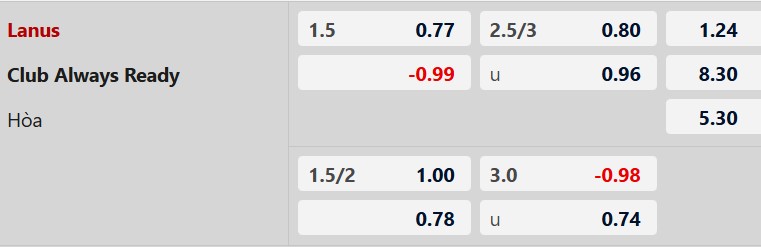 Mức chấp 1 1/2 cho thấy Lanus được đánh giá cao hơn rõ rệt. Với lợi thế sân nhà cùng chất lượng đội hình tốt hơn, đại diện Argentina hoàn toàn có khả năng giành chiến thắng cách biệt. Always Ready khó tạo nên bất ngờ khi phải thi đấu xa nhà.